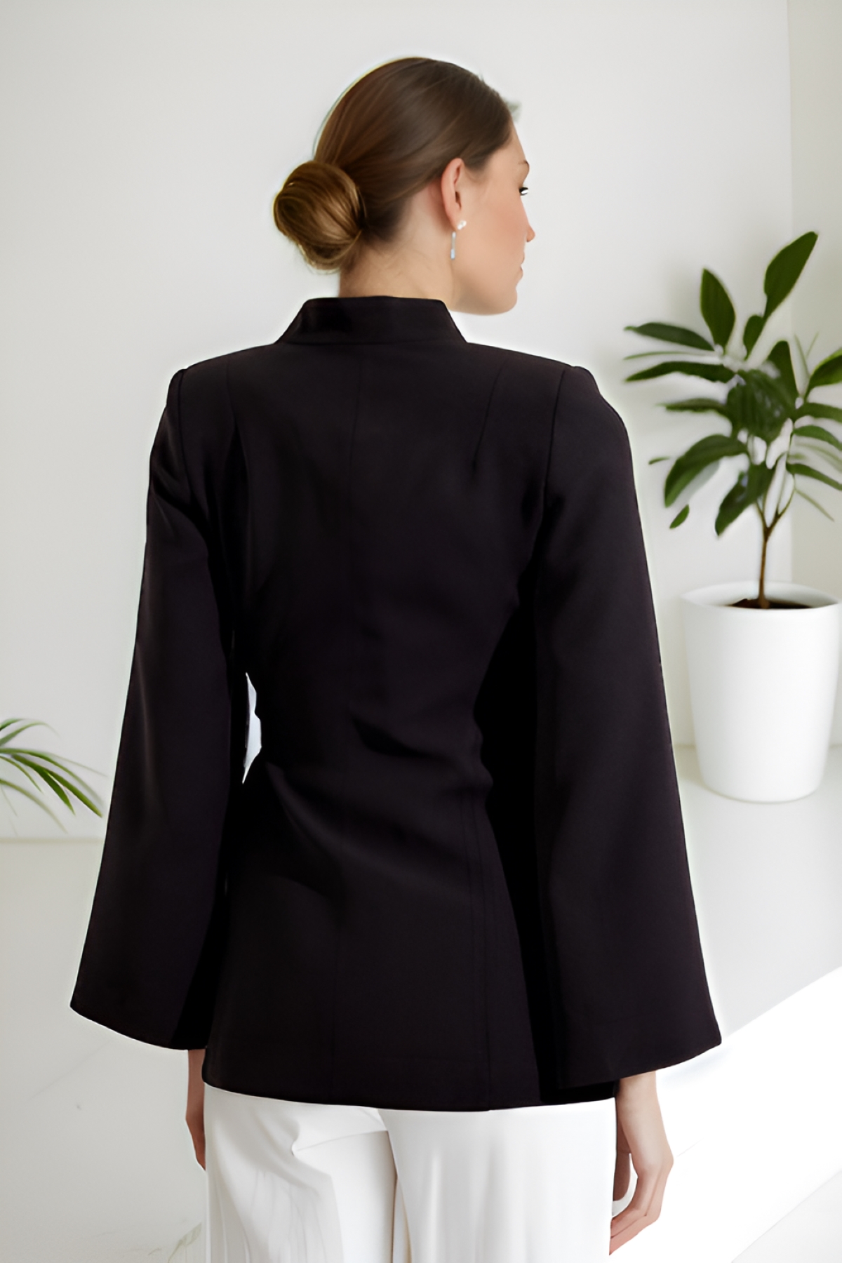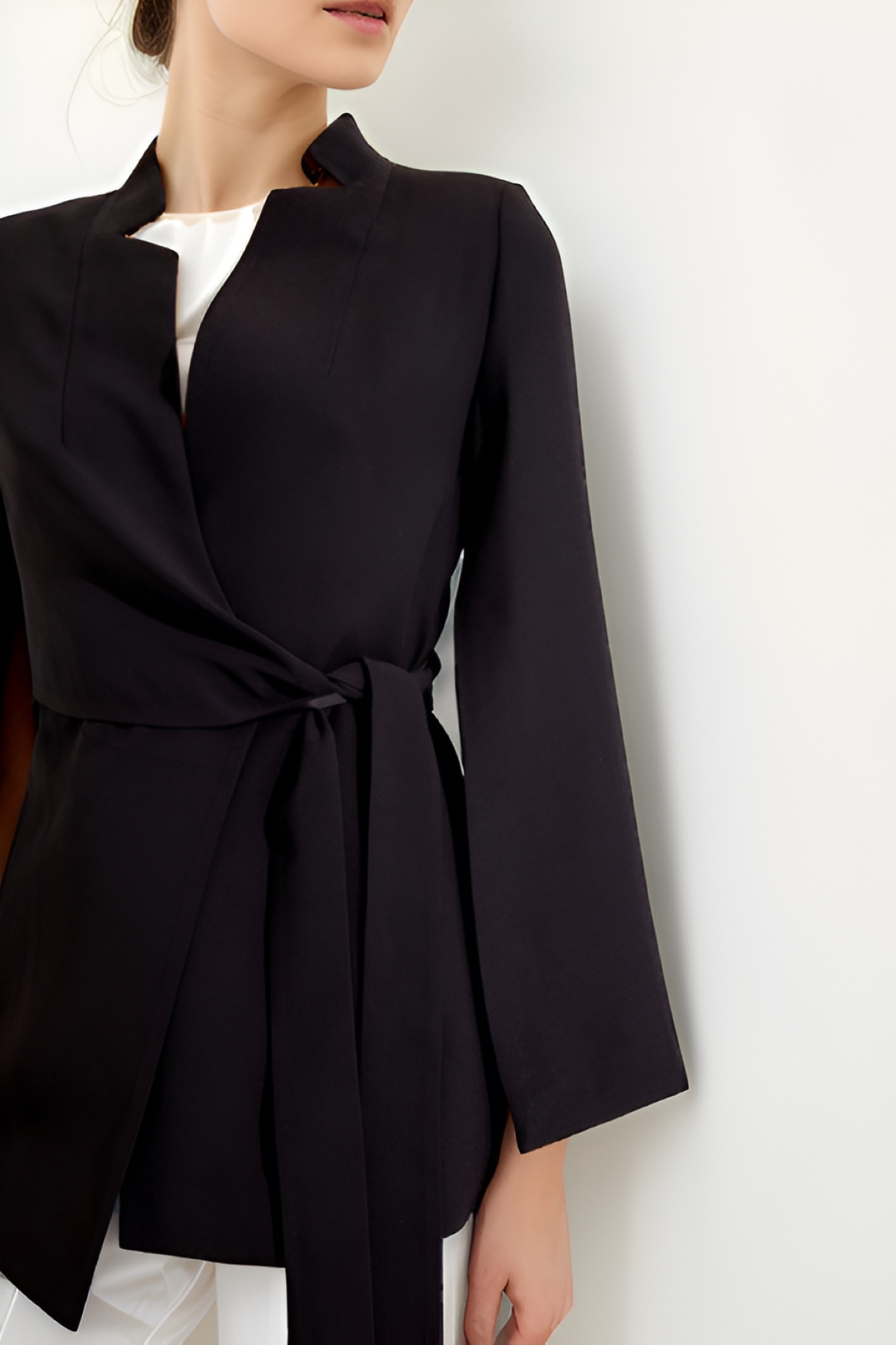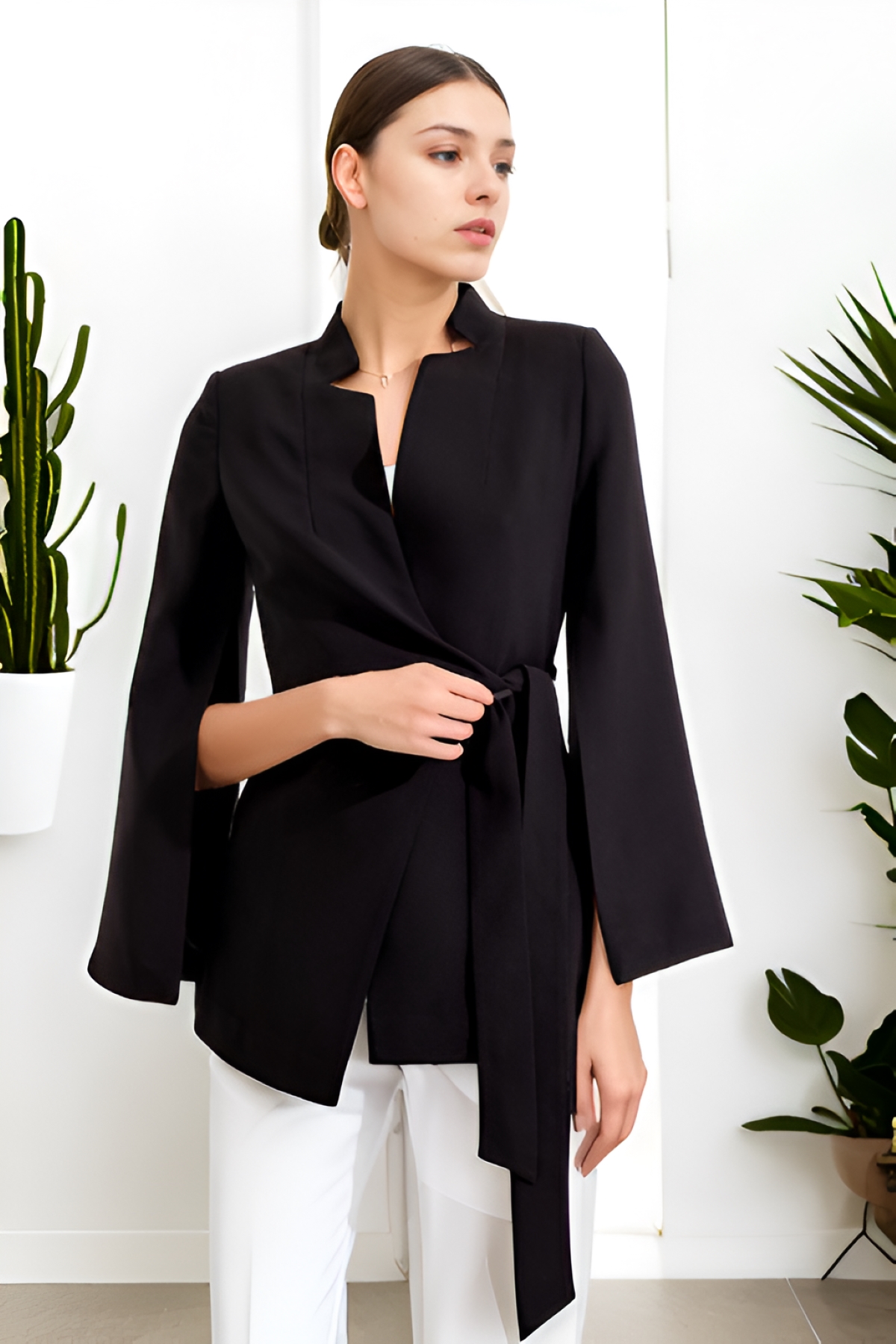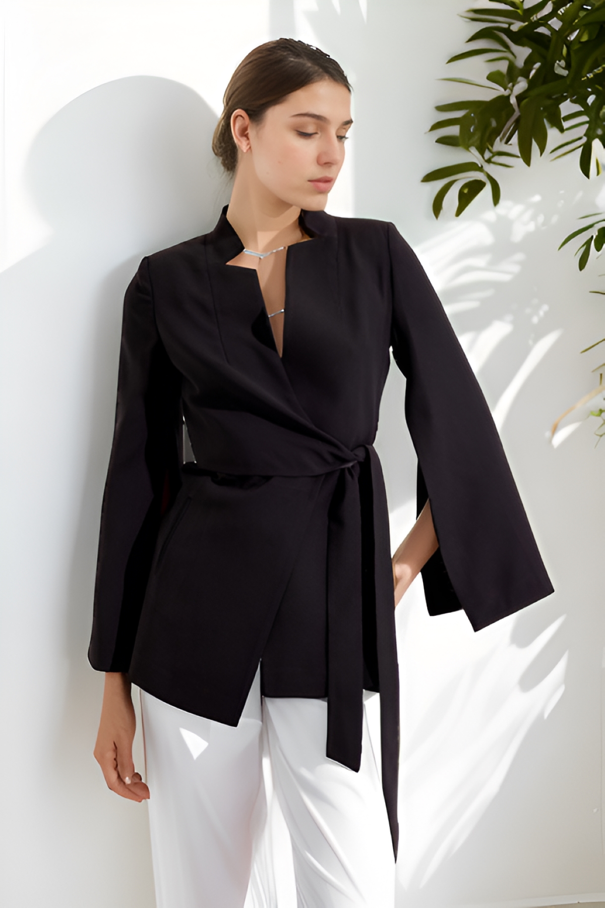 Kolları Yırtmaç Detaylı Dik Yka Belden Kuşaklı Ceket