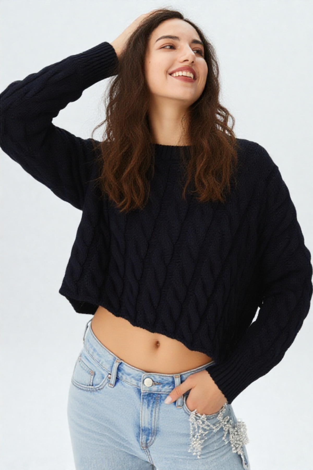 - Şık bisiklet yaka saç örgülü crop triko, çeşitli etkinlikler için uygundur.