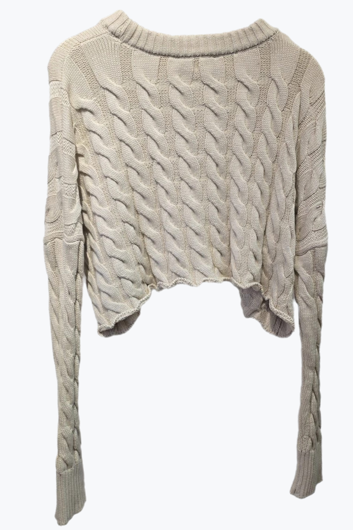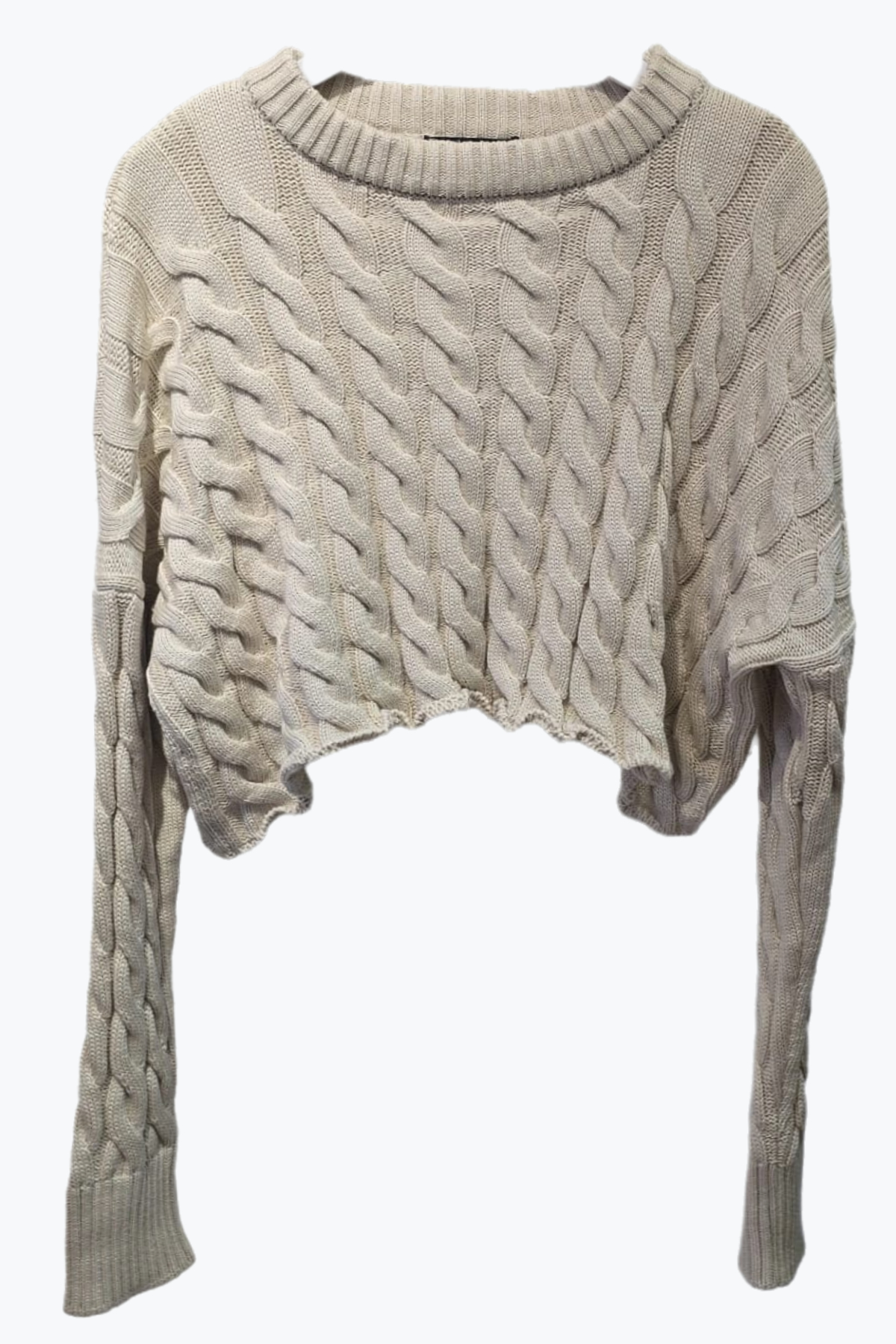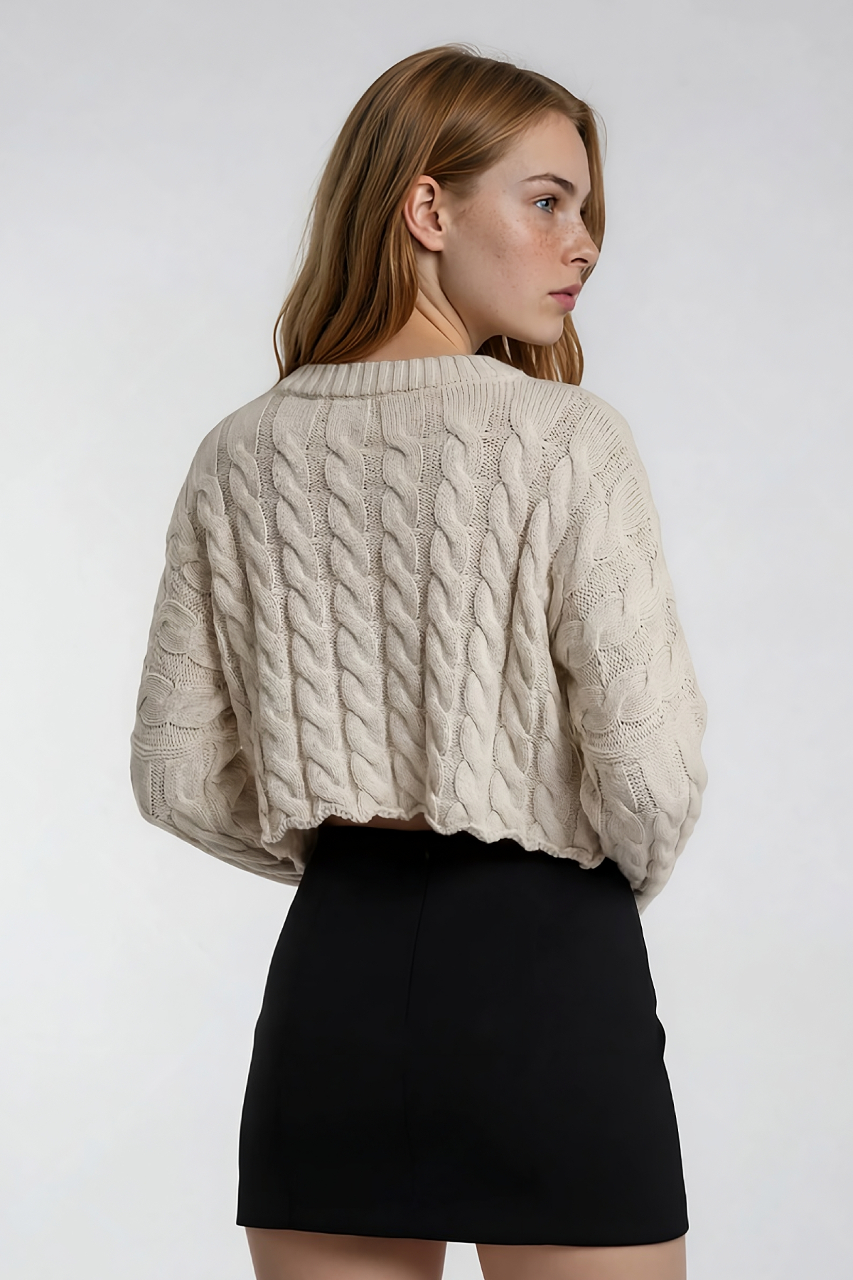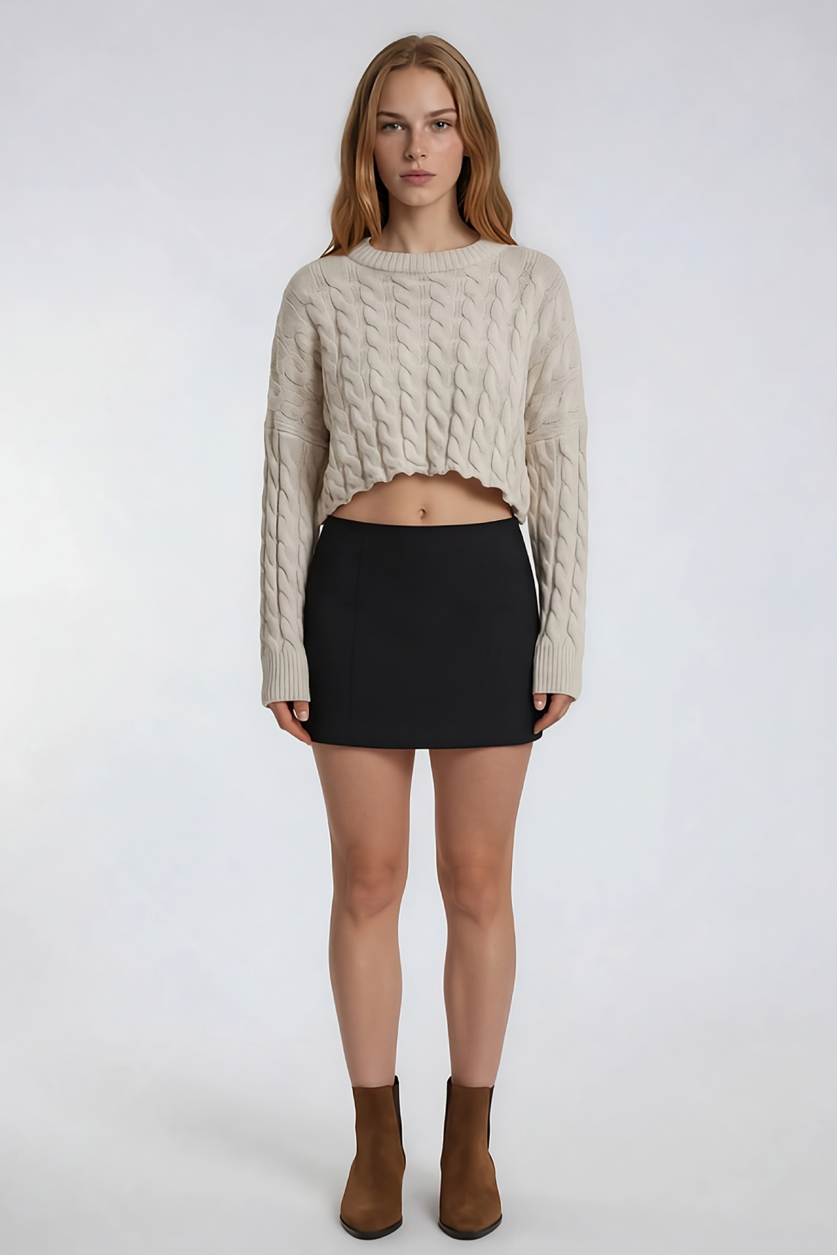 - Modern çizgileriyle öne çıkan ekru crop triko kazak, saç örgü detayları ve kısa boy tasarımıyla gardıroplara şık ve genç bir hava katıyor.